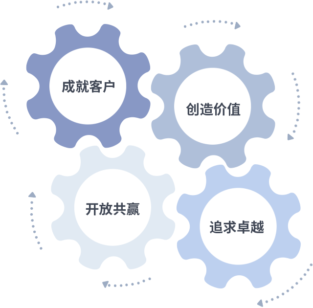 成就客户是一切决策的出发点,,,,创造价值是衡量所有工作的标准,,,,追求卓越是我们做事做人的态度,,,开放共赢是我们的格局也是最终的结果。。。。价值观的齿轮环环相扣,,推动着组织里的每个人不断向前。。。